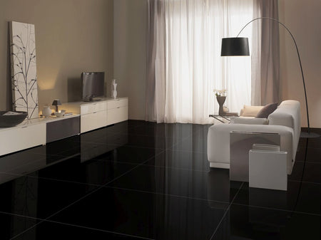 Gresie portelanată neagră, lucioasă, 60x60 cm, pentru interior și exterior.